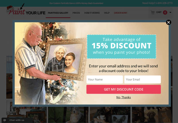 Paint Your Life specializes in creating unique, hand-painted artwork from photos taken by customers. They used the popup from the example above to get more customers during the holidays.
